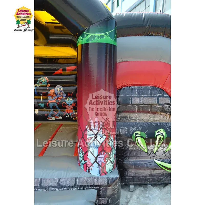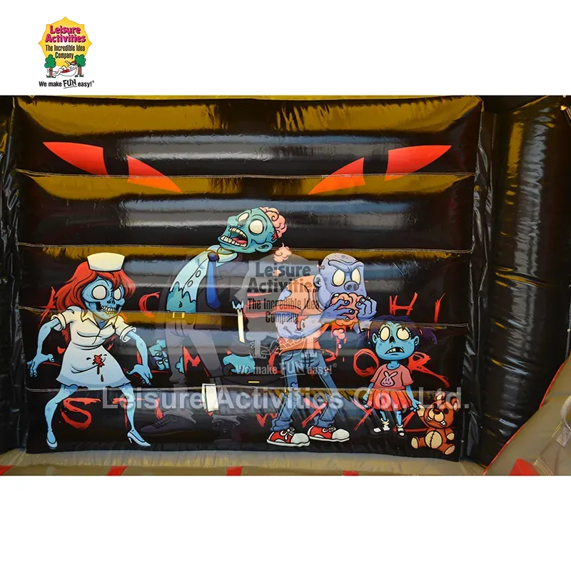 Väikesed täispuhutavad mitmemängulised hüppavad lossid, mida kummitavad liumäega: see zombie-teemaline kummitaoline täispuhutav täispuhutav lint on loodud laste lummamiseks oma põneva koomiksi-õudusliku esteetikaga. Julge kombinatsioon julgetest punastest, läikivatest mustadest ning jubedatest rohelistest ja sinist toonidest loob erksa ja põneva keskkonna. Suured mängulised joonistused multifilmi zombidest dünaamilistes poosides – nagu õde, ajusid sööv tegelane ja kaisukaruga zombilaps – on pigem lõbusad kui hirmutavad. Interaktiivsed elemendid, nagu katusel roomav suur sinine zombi, läbi seinte purskuvad küünised ja sammastel olevad ketid/graafika tekitavad kujutlusvõimet. Suletud konstruktsioon koos kaitsva pealiskattega pakub varju ja kerge vihmakaitse, samas kui suletud liumägi lisab seiklust. 10 jala kõrgus muudab selle mitmekülgseks kasutamiseks nii sise- kui ka välistingimustes, sobides ideaalselt Halloweeni pidudeks, sügisfestivalideks, temaatilisteks sünnipäevaüritusteks ja õudseks lõbuks tagaaias.